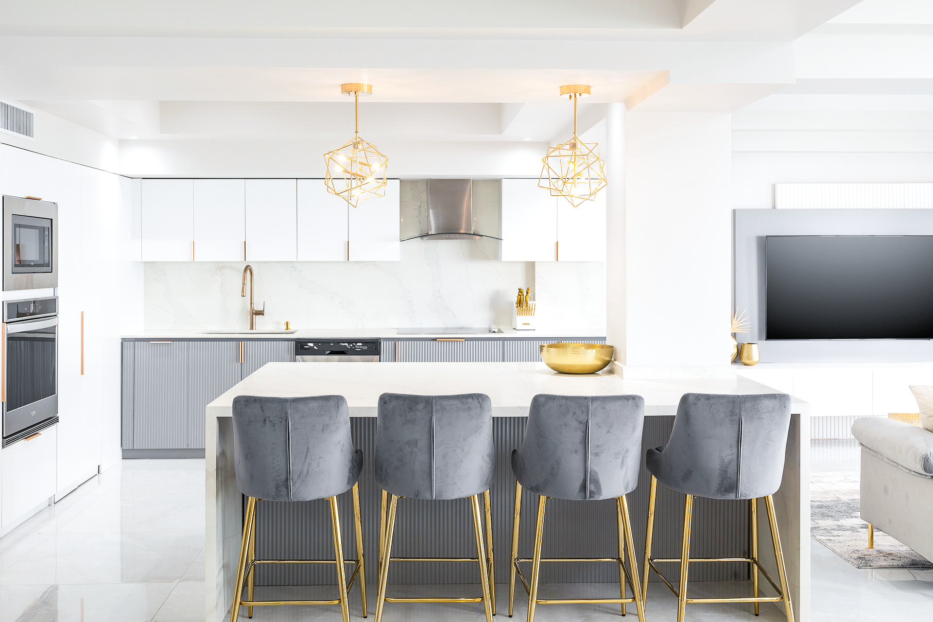 In the center of the room there is a functional zoning volume, a white cube, dividing the entire living room into 5 zones: active pastime area, TV area, dressing area, secluded relaxation area and the central area – relaxation area, located inside the white volume.